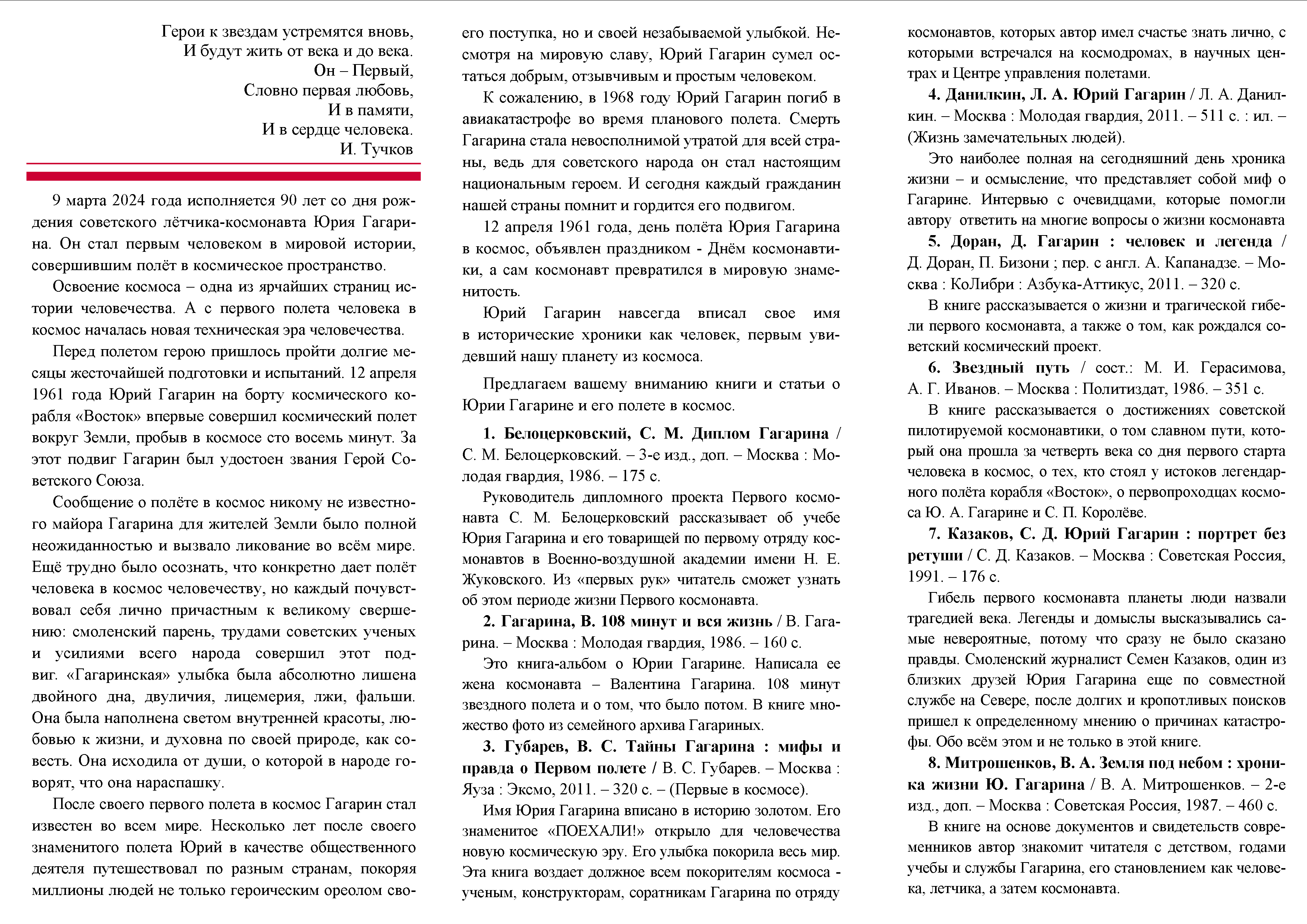 Библиографическая памятка к 90-летию Юрия Алексеевича Гагарина