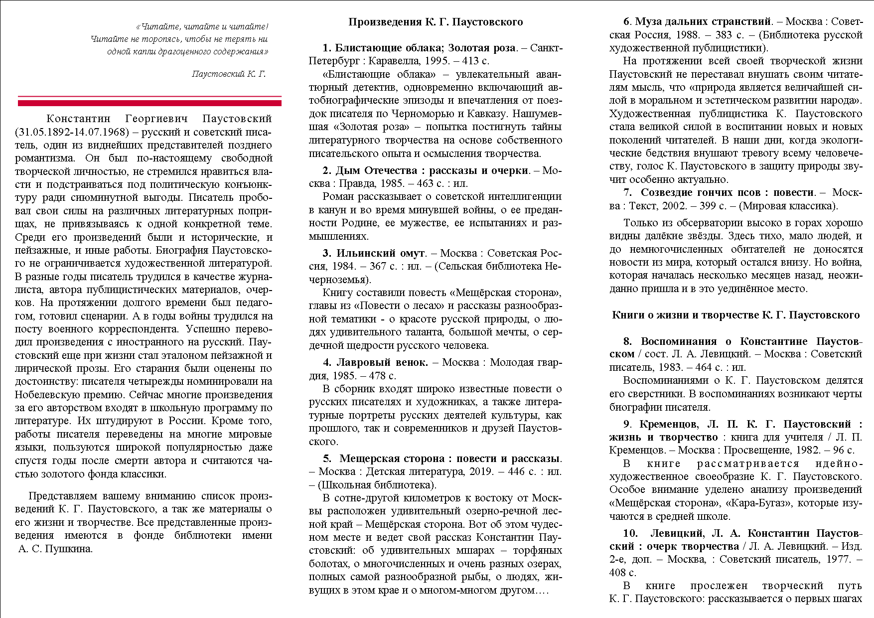 Библиографический список к 130-летию Константина Григорьевича Паустовского