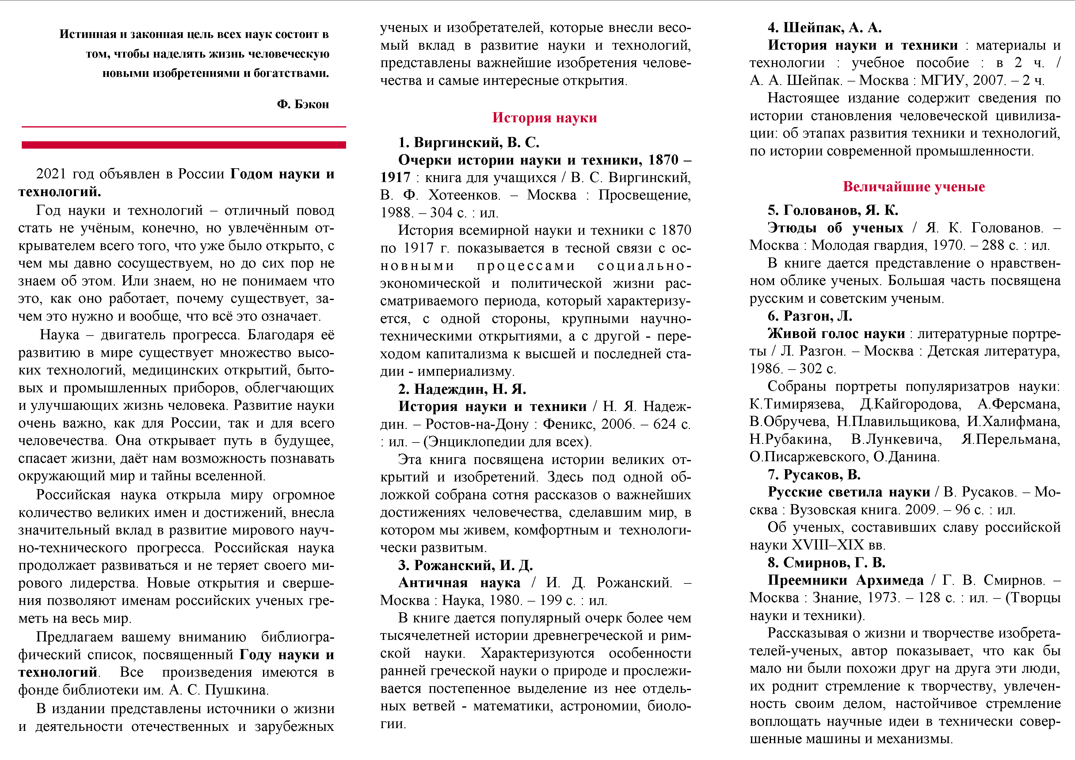 Библиографический список к Году науки и технологий