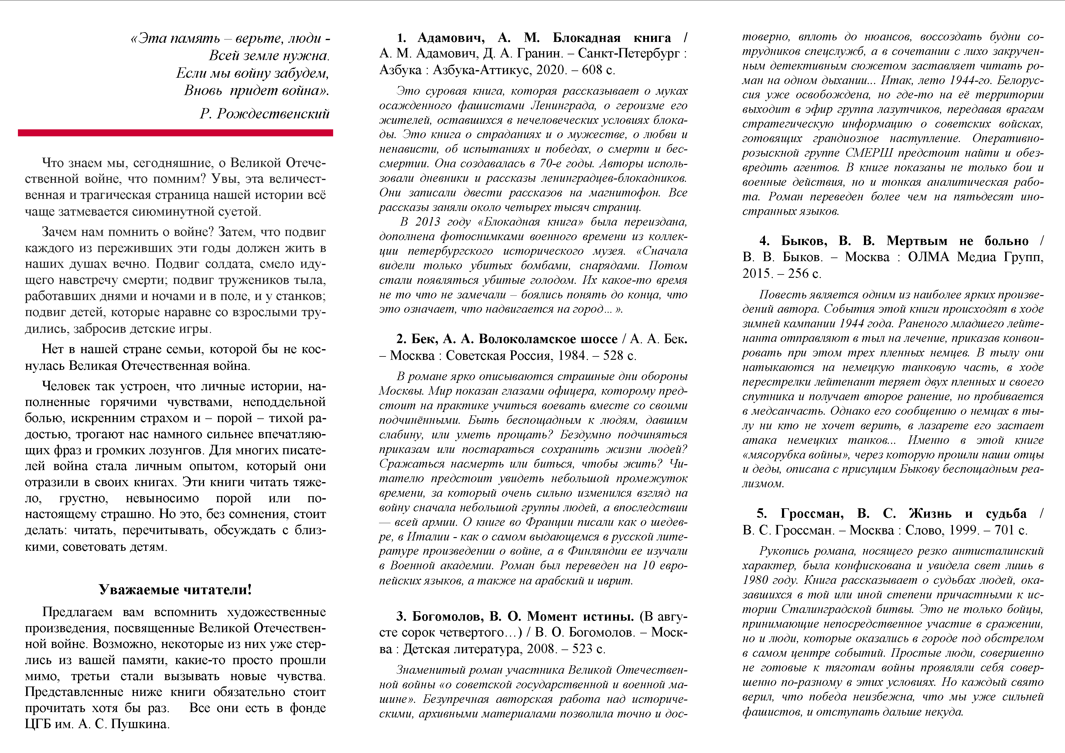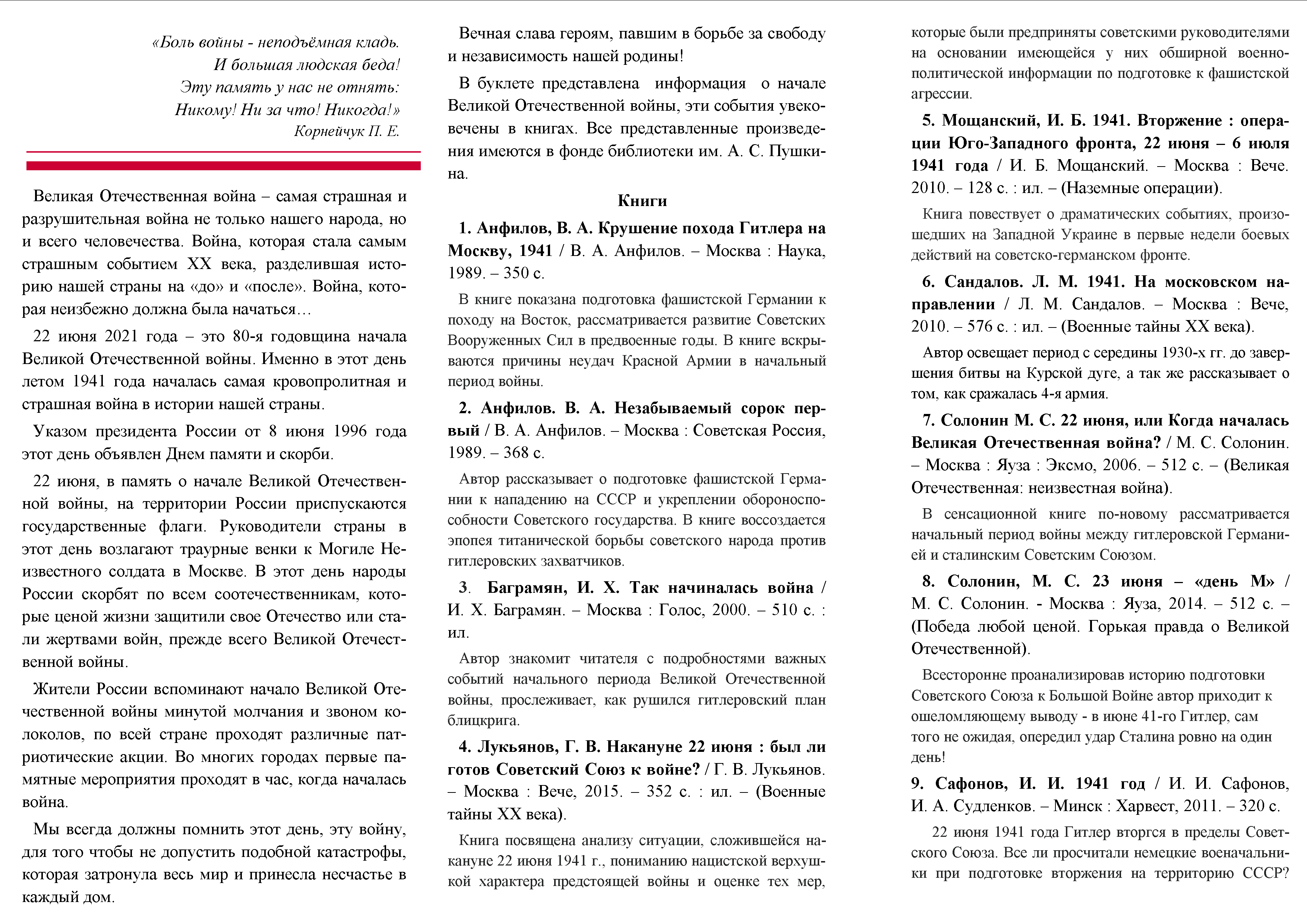 Библиографический список к 80-летию начала Великой Отечественной войны