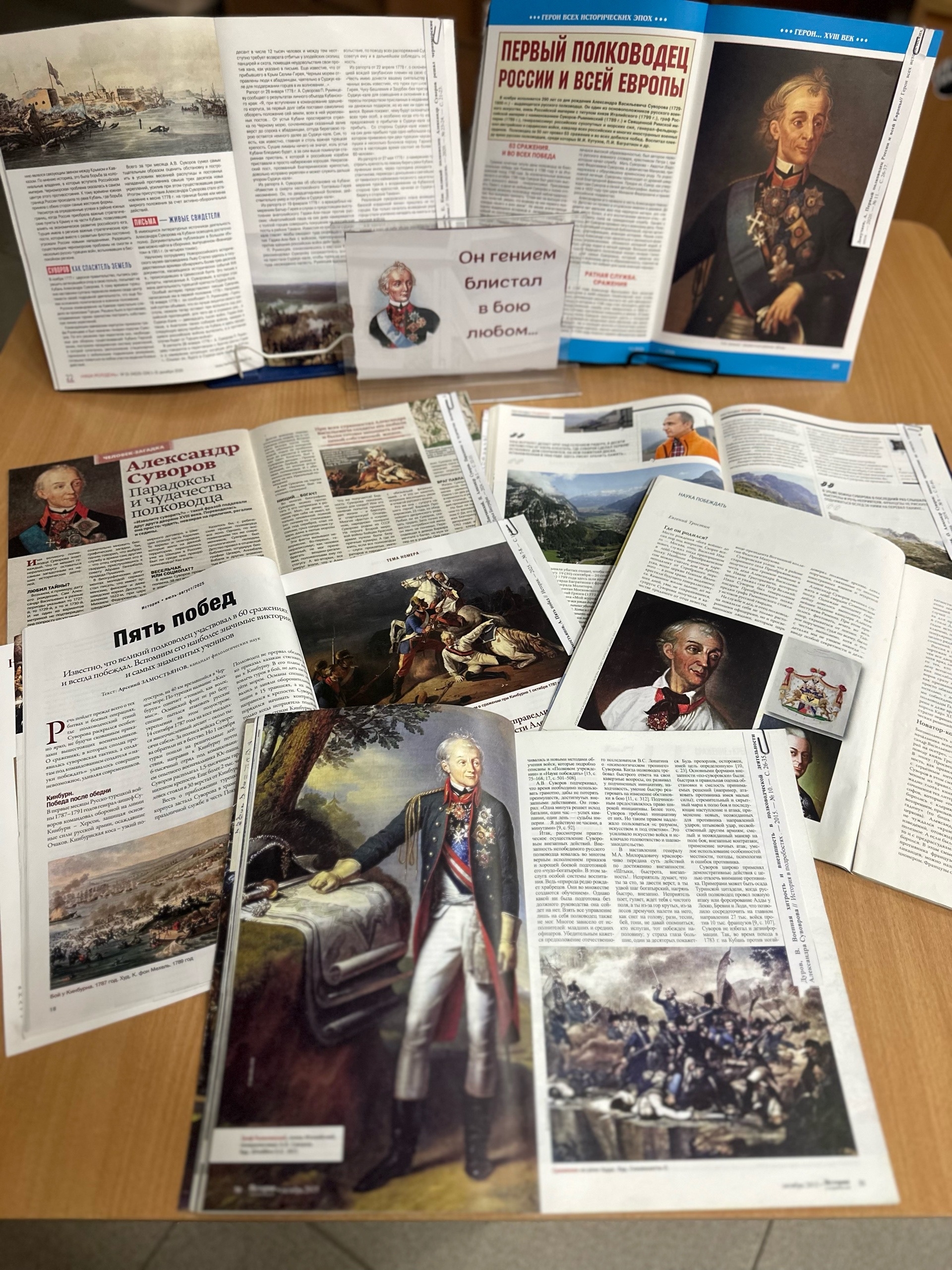 24 ноября исполнится 295 лет со дня рождения выдающегося русского полководца, одного из основоположников русского военного искусства, генералиссимуса Александра Васильевича Суворова, родившегося в 1730 году. Выставка-портрет «Он гением блистал в бою любом…» посвящена этому великому стратегу, чья жизнь и деятельность оставили значительный след в истории России. Экспозиция предоставляет читателям уникальную возможность глубже ознакомиться с личностью и достижениями Суворова, его стратегическим мышлением и военным искусством.