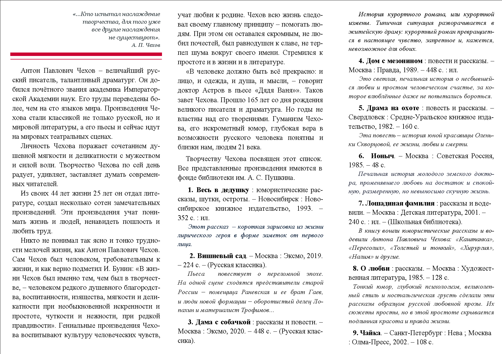 Библиографическая памятка к 165-летию А. П. Чехова