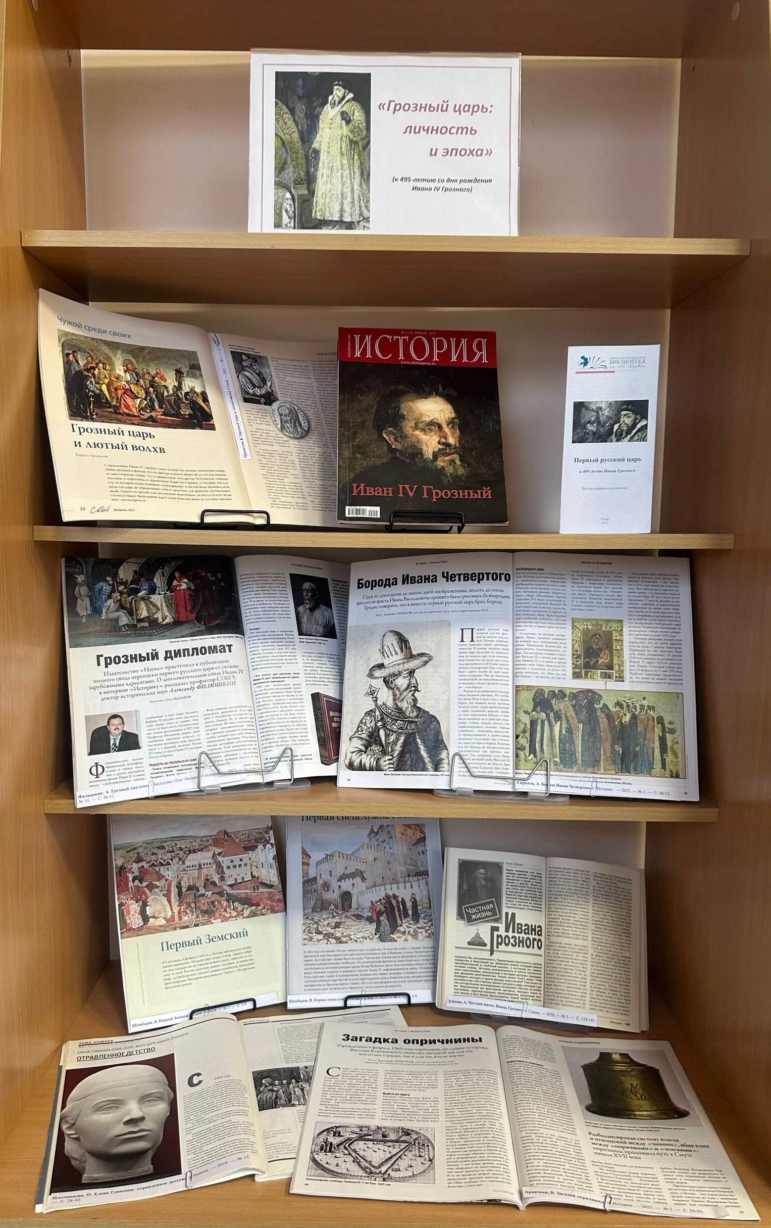 В секторе электронных ресурсов и периодических изданий представлена выставка «Грозный царь: личность и эпоха» приуроченная к 495-летию со дня рождения Ивана IV Грозного, призванная осветить жизнь и эпоху одного из самых противоречивых правителей в истории России, а также его вклад в формирование российского государства.