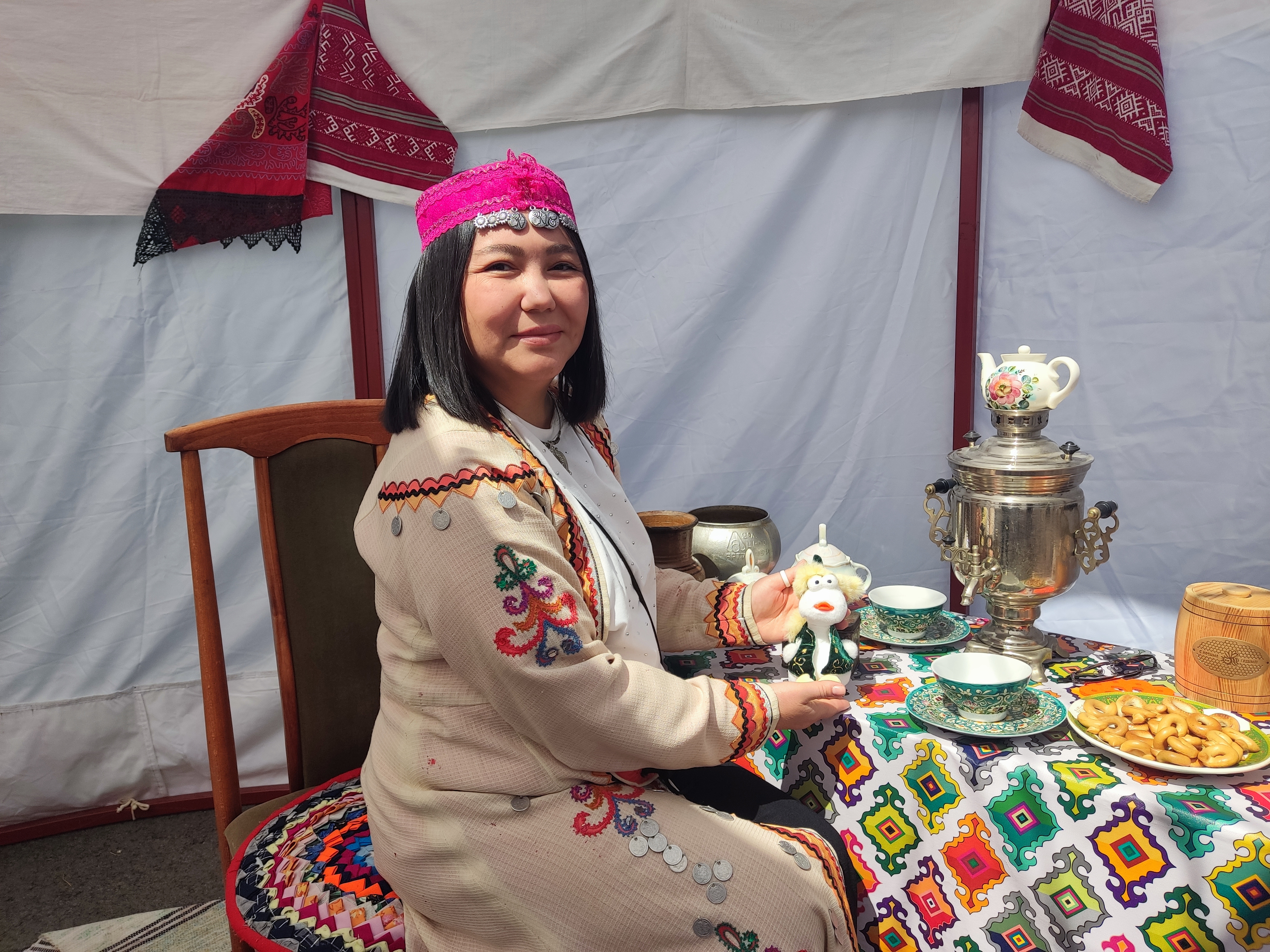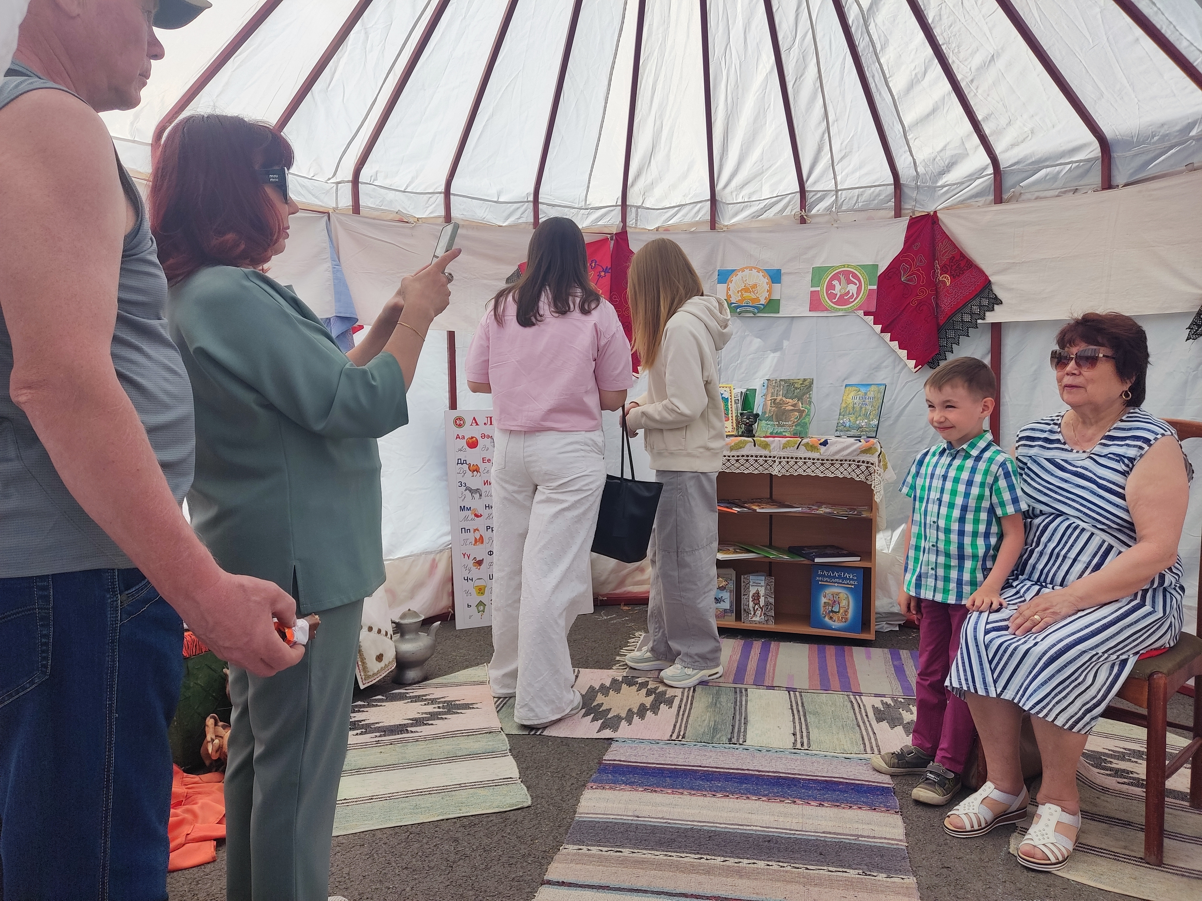 Библиотекари с удовольствием демонстрировали книги и журналы о культуре и традициях татар и башкир, приглашая гостей погрузиться в мир народной мудрости и красоты. Особой популярностью пользовалась фотозона внутри юрты: каждый мог примерить элементы национальных костюмов и сделать памятное фото.