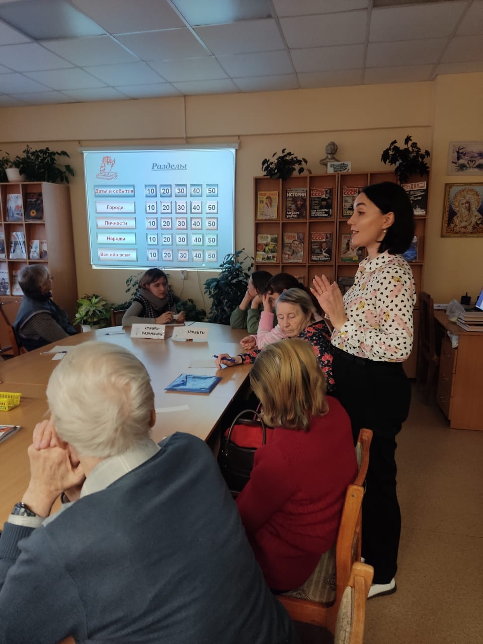 Команды по очереди выбирали разделы (даты и события, города, личности, народы, всё обо всём) и вопросы ценностью от 10 до 50 баллов. По результатам игры победили «Эрудиты», завоевавшие 33 балла. У «Умников-разумников» - 29 баллов.